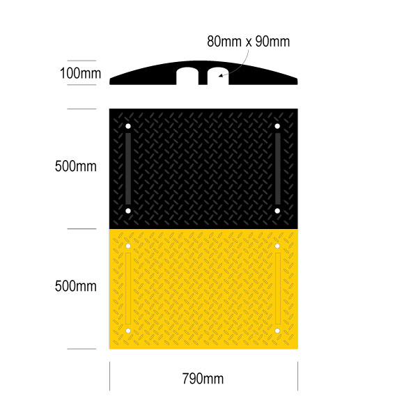 Our thermoplastic cable ramps are ideal protection for cables and hoses. Their heavy-duty construction will cater for high traffic volumes and can be bolted to the ground for more permanent applications. The modules offer two large channels, 80mm x 90mm, catering for a variety ofhose and cable sizes. Ramps are supplied in alternate black and yellow modules.