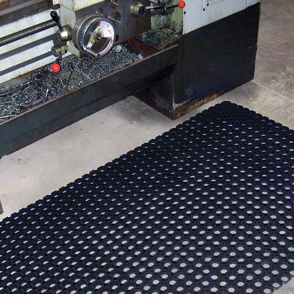 The Engineers Mat is a medium duty, 100% natural rubber, anti-slip, comfort Mat used high use situations. The honeycombed patterned surface provides traction when the mat is being walked on, and the large holes allow for rapid drainage of any spilt liquids and the containment of dropped metal shavings. This mat is suitable for use in wet or dry areas, with heavy use, where comfort, relief and traction is needed. This product is stocked in one standard size and comes either block sided or as a bevelled edged option, to allow easy access on and off for foot or wheeled traffic and to prevent trips.